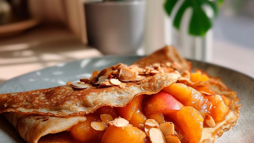 El durazno aporta ese dulzor natural, casi floral, que combina perfecto con la masa delgada de la crepa.