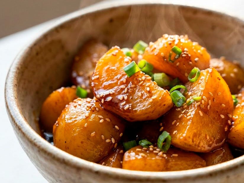 Este gamja-jorim versión desayuno mantiene el glaseado característico con menos sal y azúcar. Queda tierno por dentro, brillante por fuera y rinde para 2–3 mañanas.