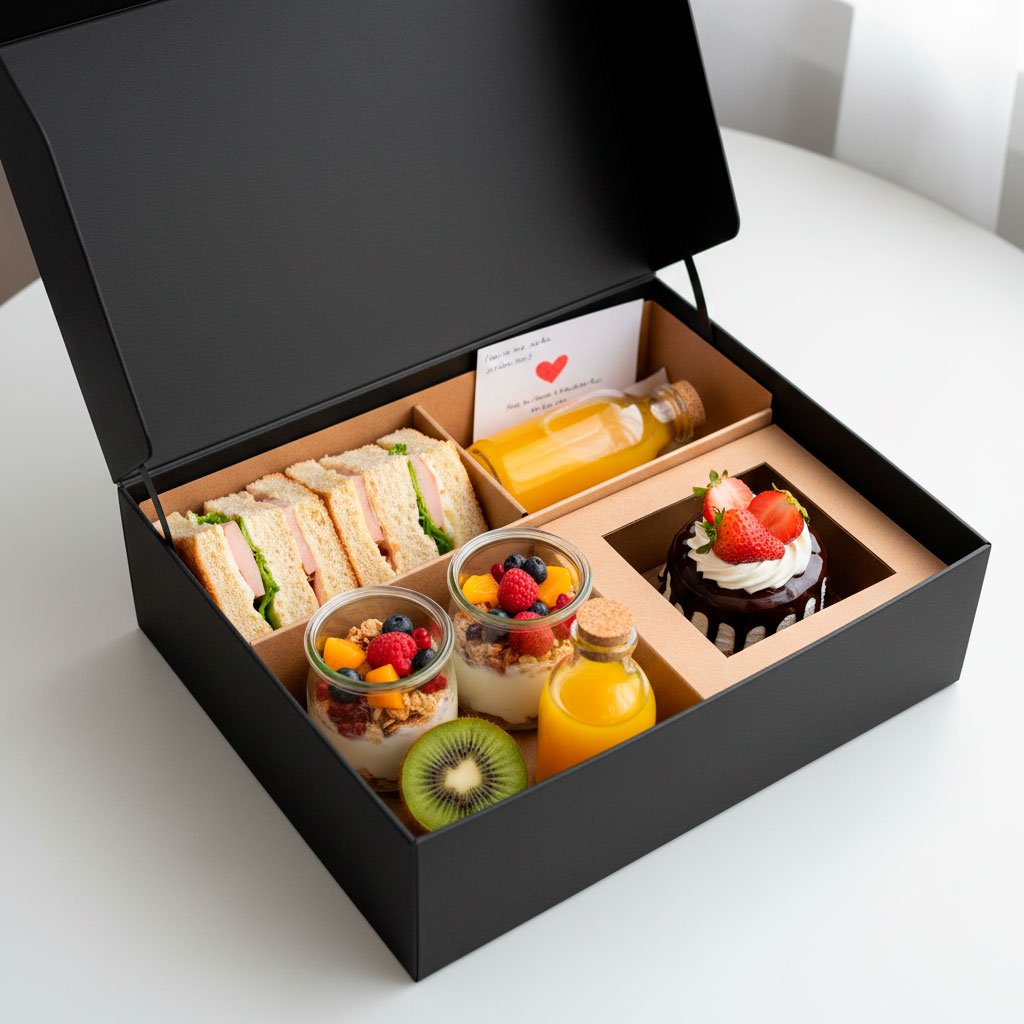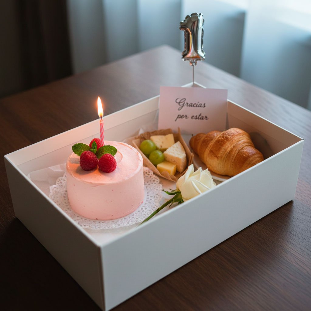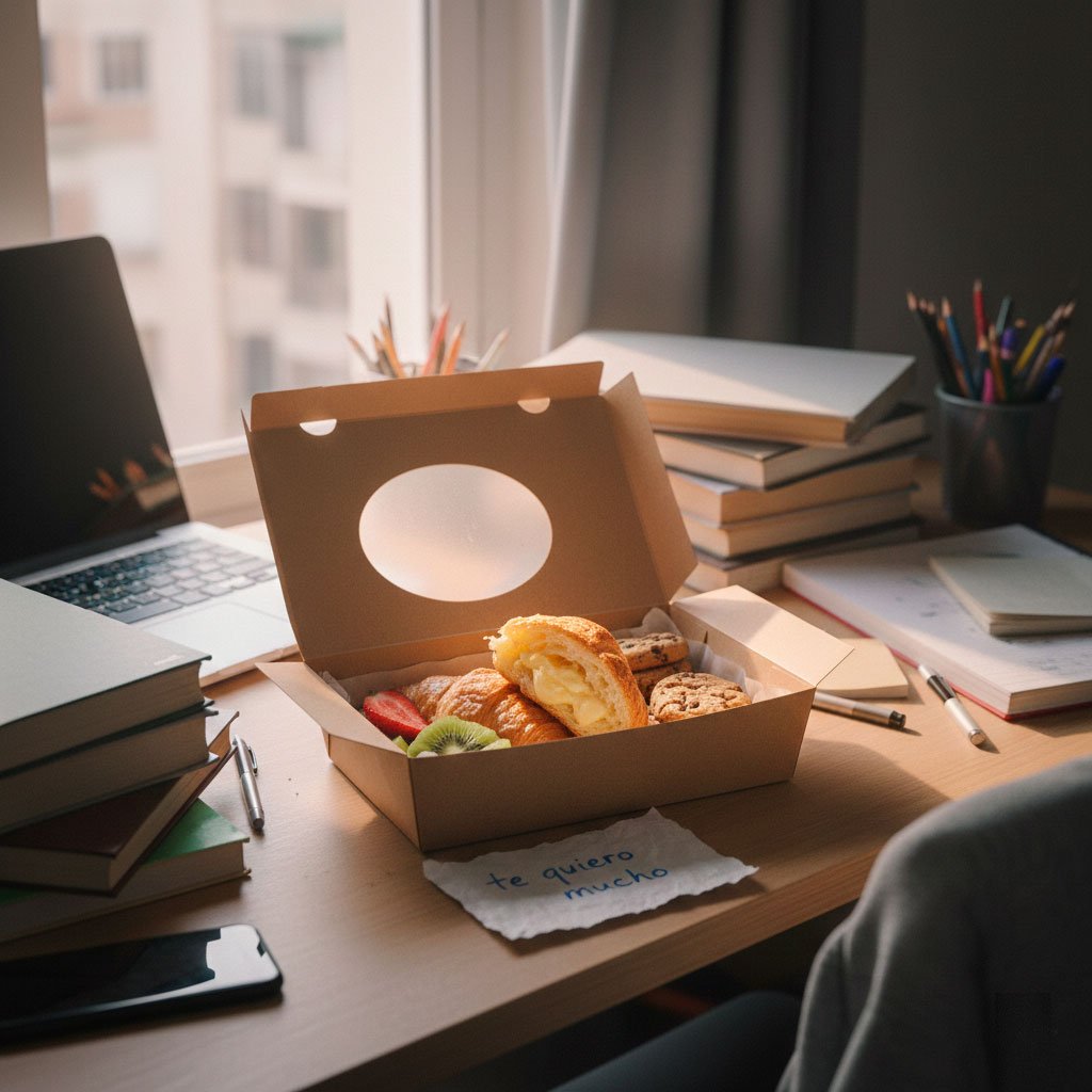 Una caja que se abre despacio, el aroma tibio del pan recién hecho, un niño envuelto de nuez caramelizado, las fresas brillando como si tuvieran luz propia o un croissant suave que esconde un relleno inesperado, el jugo natural frío en una botella bonita y una nota escrita a mano que dice justo lo que esa persona necesitaba leer.
