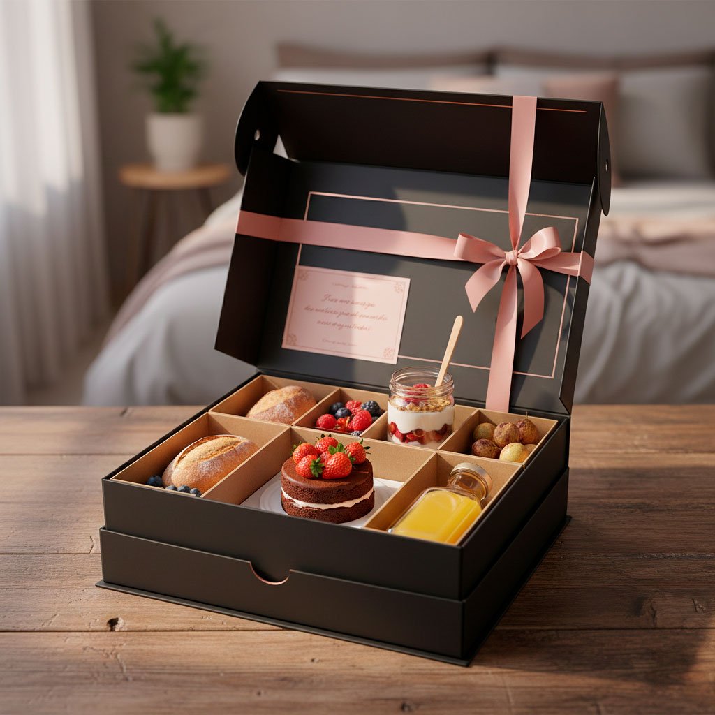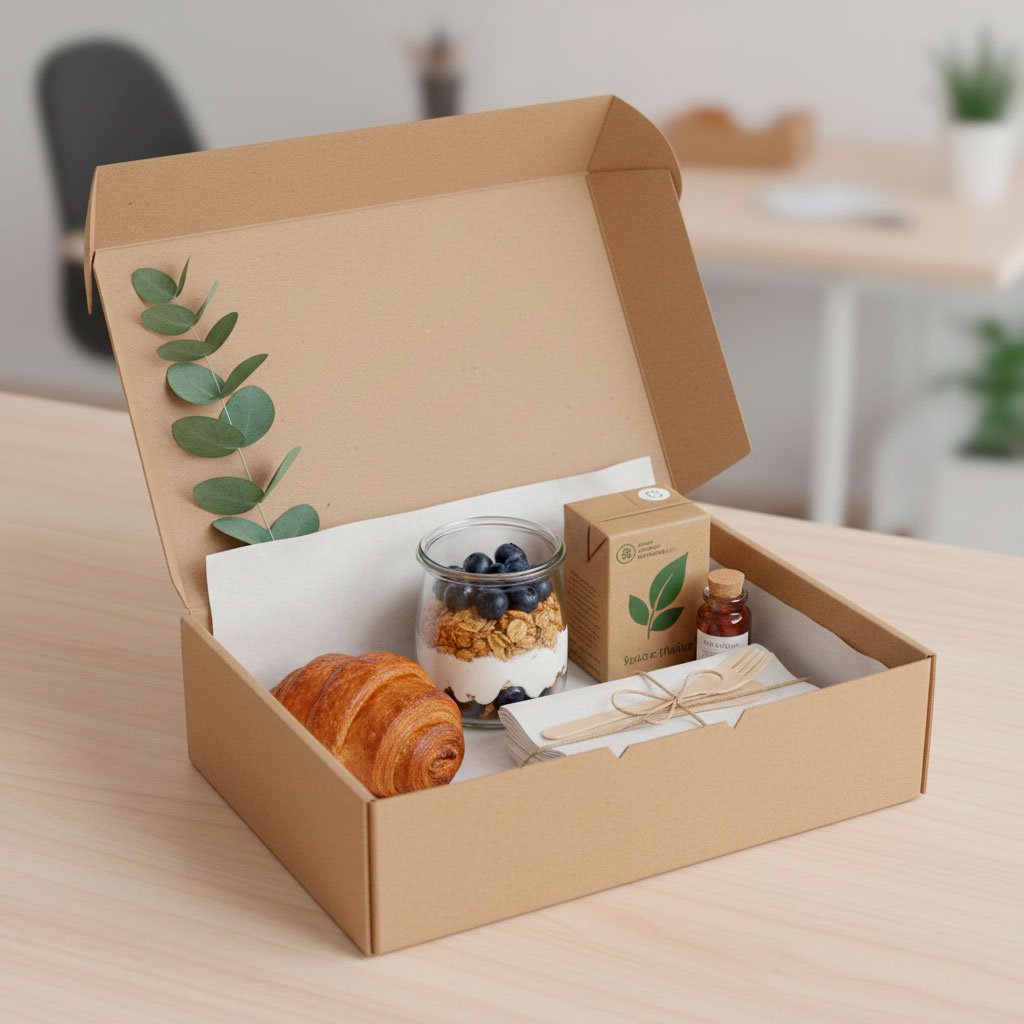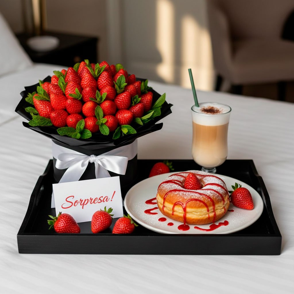 Una caja que se abre despacio, el aroma tibio del pan recién hecho, un niño envuelto de nuez caramelizado, las fresas brillando como si tuvieran luz propia o un croissant suave que esconde un relleno inesperado, el jugo natural frío en una botella bonita y una nota escrita a mano que dice justo lo que esa persona necesitaba leer.