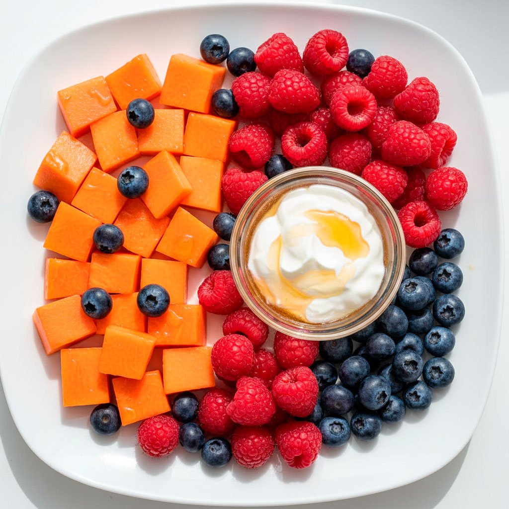 - Usa 2–3 frutas de temporada bien acomodadas.
