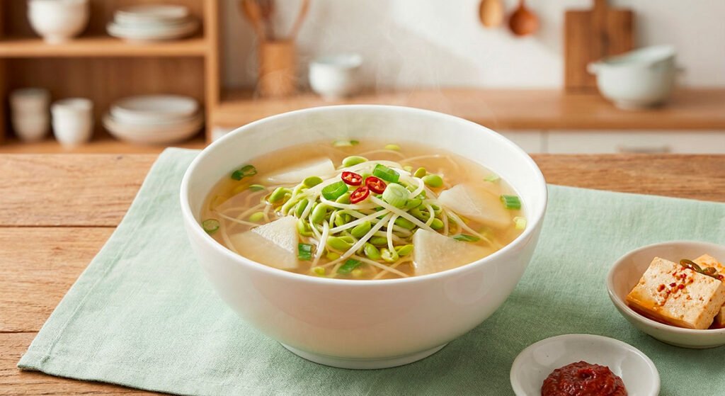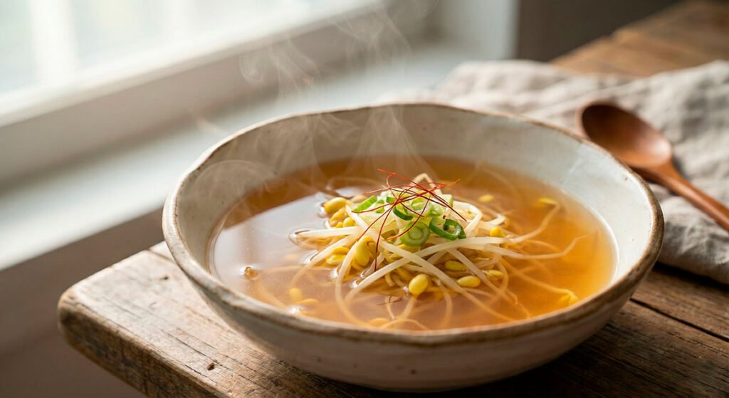 Sopa clara de brotes de soya al estilo coreano: ligera, reconfortante y perfecta para empezar la mañana sin pesadez.